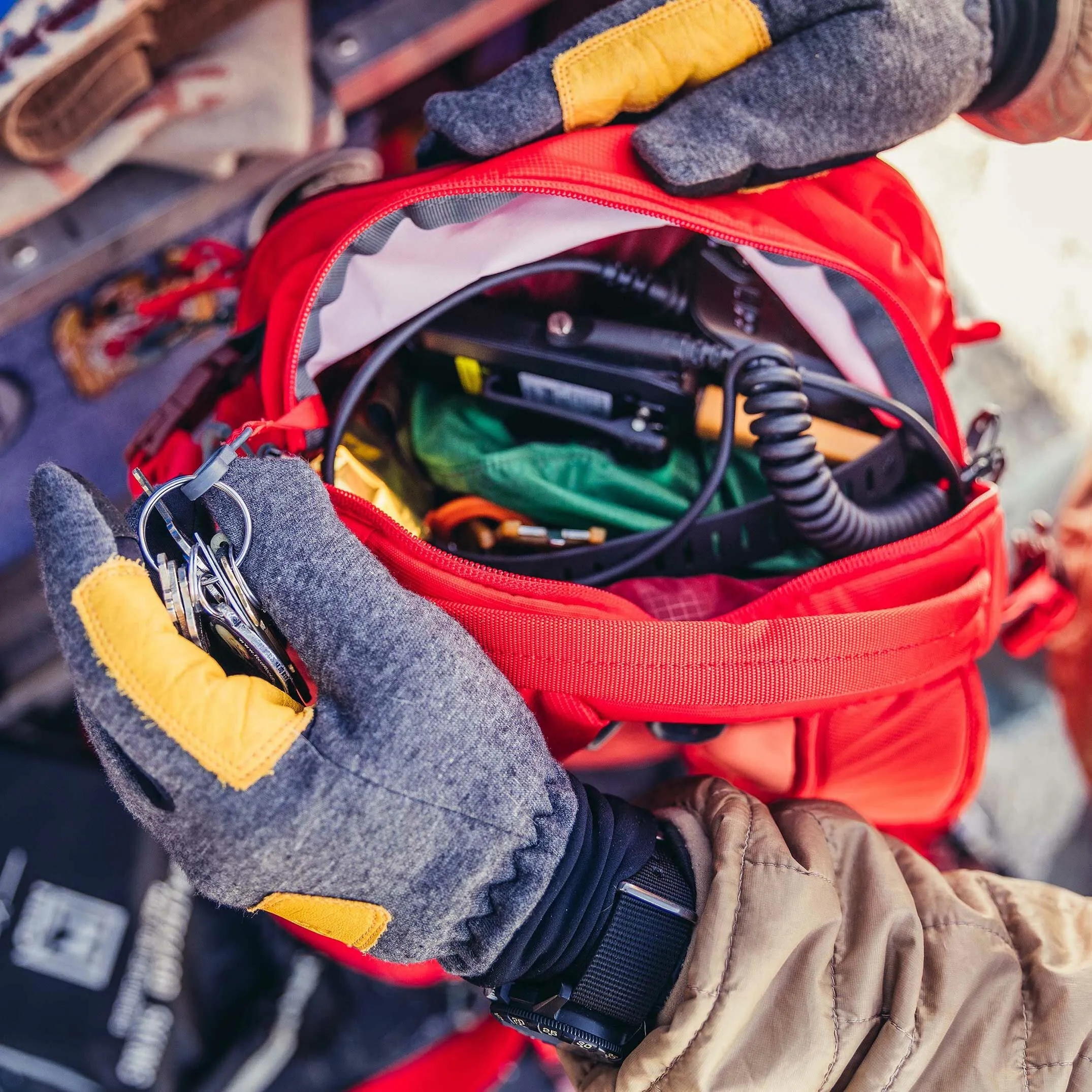 - Poche frontale de sécurité en cas d’avalanche, à accès rapide et à fermeture éclair, avec organisation des outils