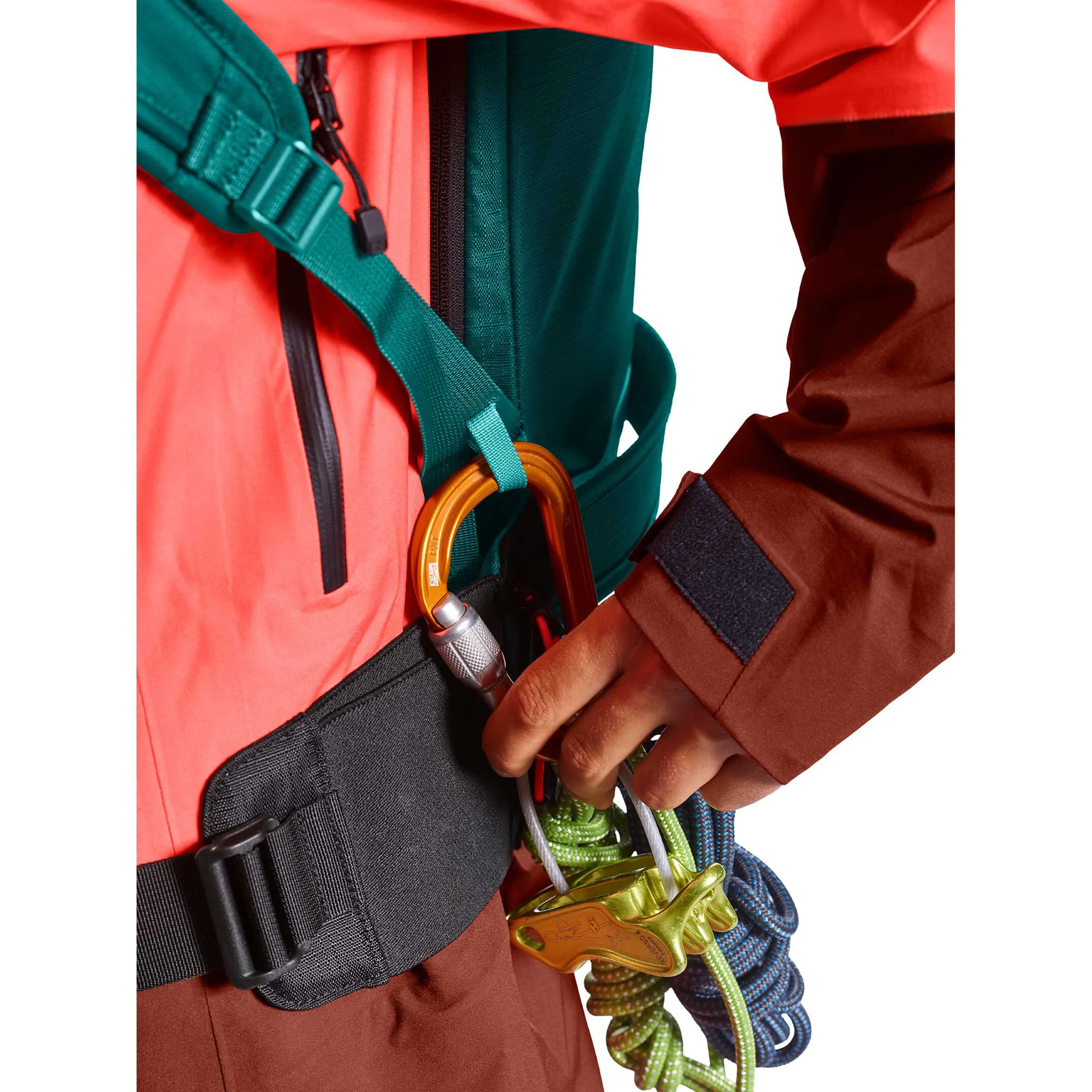 Afin de s’ajuster au mieux lors de vos sorties, ce sac à dos peut être rapidement comprimé grâce à des sangles intégrées sur les côtés pour épouser le dos comme une seconde peau à plat. Pour une descente en rappel ou un court passage de marche, ce sac à dos de freeride dispose de toutes les possibilités de fixation nécessaires pour les skis, le piolet ou la corde. Il est aussi doté d’un filet pour le casque, une carte d’urgence et prêt à recevoir un système d’hydratation. Toutes ces options de fixation extérieures sont bien dissimulées, de sorte qu’on ne risque pas de s’accrocher n’importe où, même en terrain accidenté.