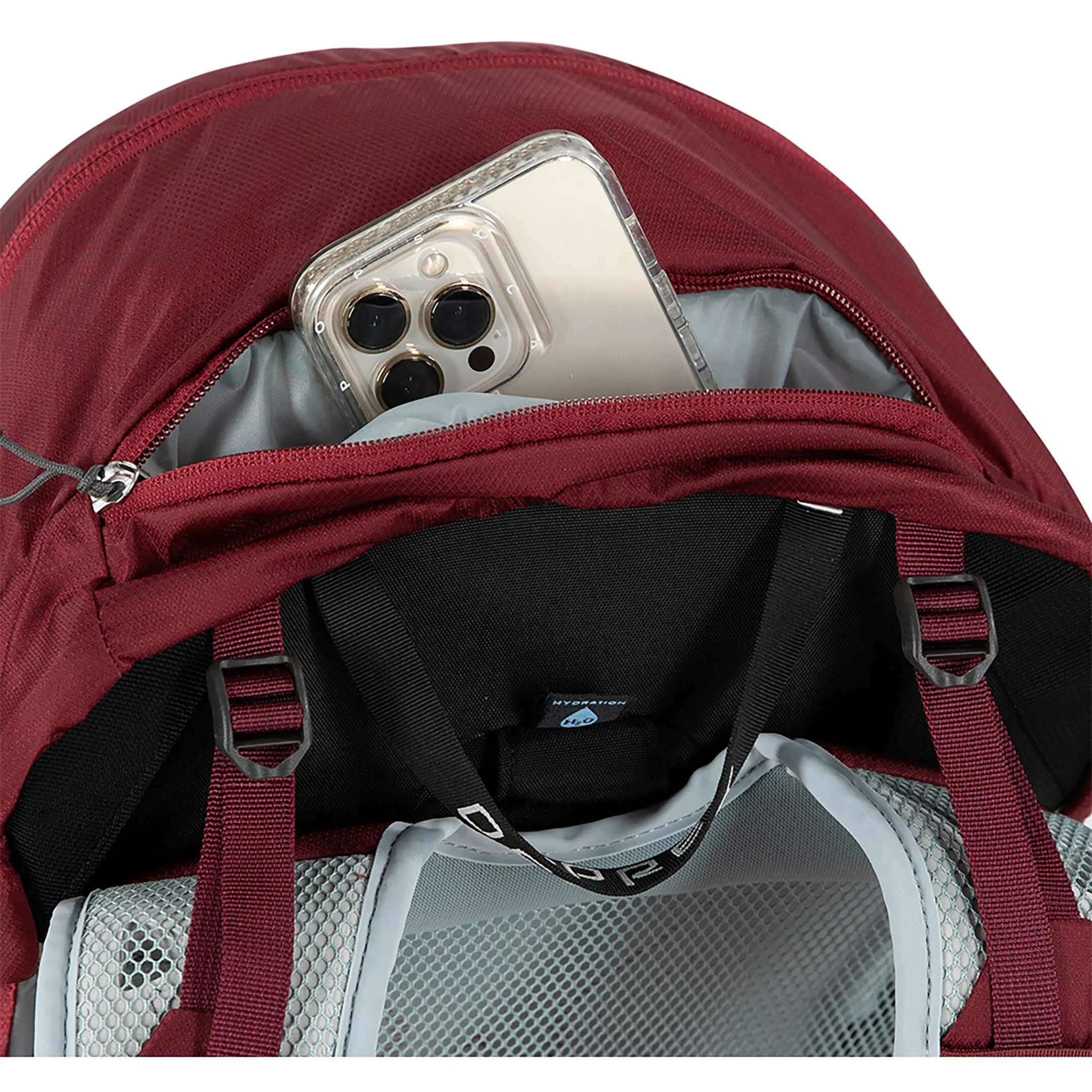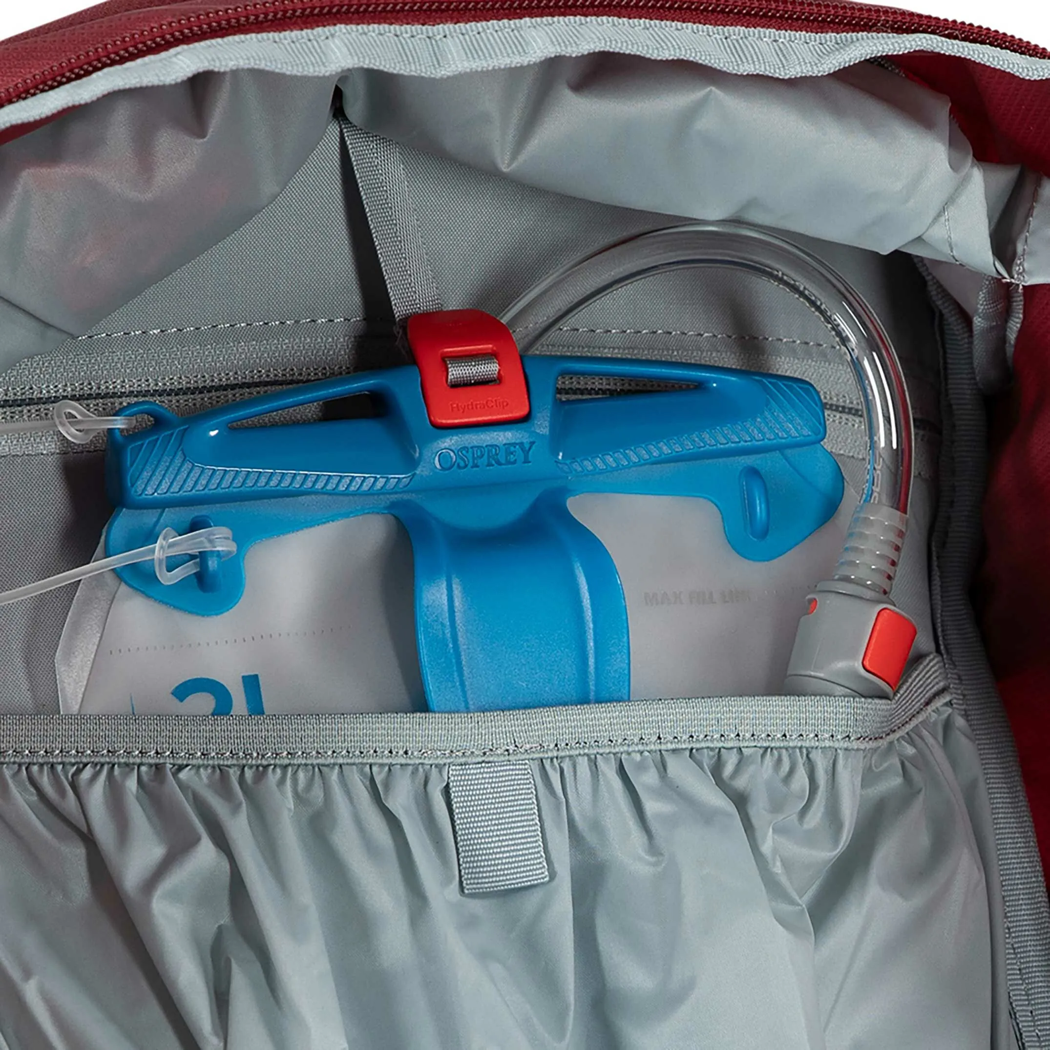 - Internal reservoir sleeve with hose port in backpanel and Osprey Hydraclip for easily hanging a reservoir